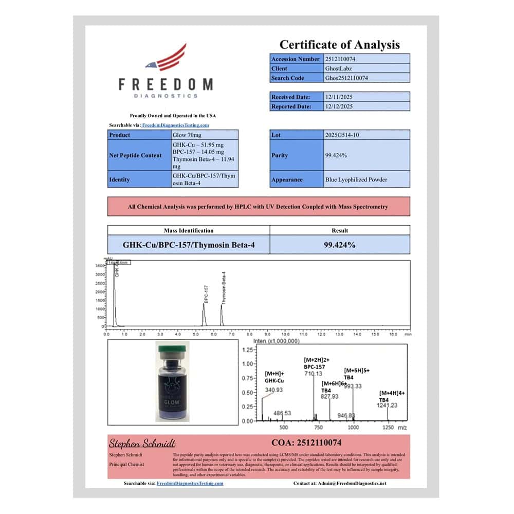 The 70mg GLOW compound is provided in lyophilized powder form to preserve structural integrity and support long-term storage stability. Lyophilization removes moisture under controlled freeze-drying conditions, helping maintain molecular consistency and minimize degradation during storage. This preservation method is widely utilized in peptide research due to its ability to enhance shelf life and ensure reliable performance across experimental procedures. Each production batch undergoes analytical verification to confirm ≥99% purity, ensuring consistent material quality suitable for scientific investigation.