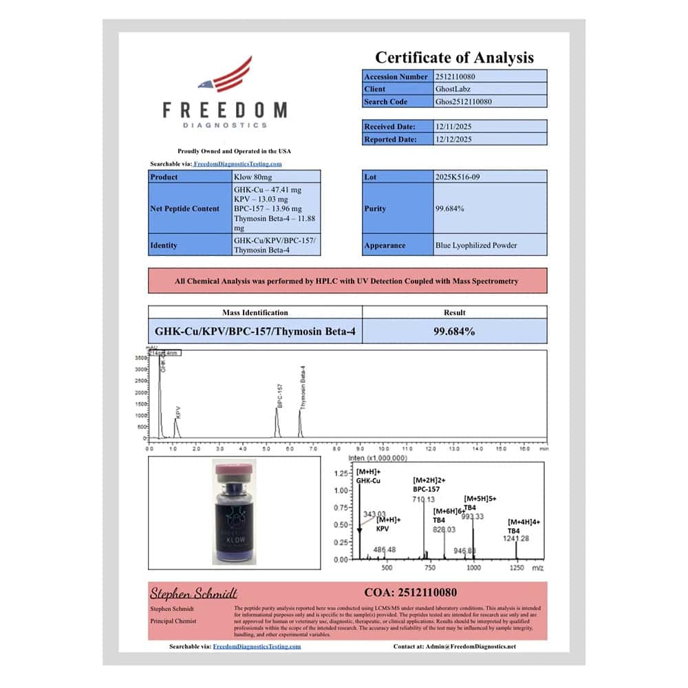 KLOW is a proprietary peptide-based research compound supplied as a high-purity lyophilized powder for laboratory research applications. This research-grade KLOW 80mg vial is manufactured under strict quality control standards and analytically verified to ensure purity, identity, and batch consistency. KLOW is referenced within experimental research settings examining multi-pathway peptide interactions and receptor-mediated signaling mechanisms under controlled laboratory conditions.